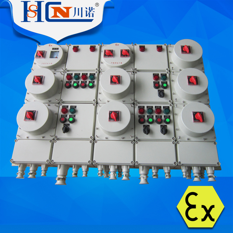 A、外殼采用鑄鋁合金壓鑄成型,表面噴塑。主腔采用隔爆型結(jié)構(gòu),接線腔增安型結(jié)構(gòu)。內(nèi)可選配裝斷路器、交流接觸器、熱繼電器、Ex防爆控制按鈕、Ex防爆信號燈等。配電箱采用模塊化設計,各種回路可以自由組合,電器元件選型可由用戶而定,其結(jié)構(gòu)緊湊、外形美觀。進出線采用鋼管或電纜布線均可,進出線口方向可由用戶要求而定。